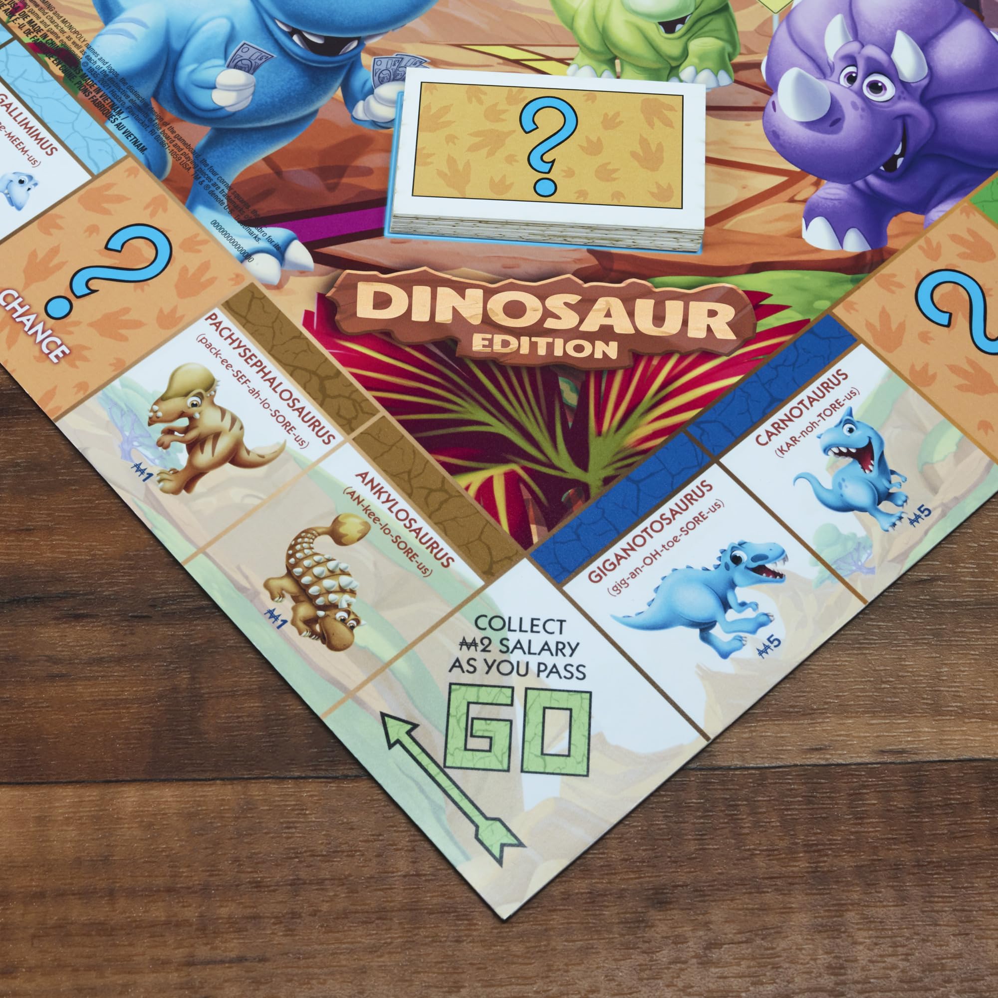 - DINO-THEMED JUNIOR MONOPOLY TOKENS: Rawrrr. Imagine stomping around as a dinosaur. Board game has players move their adorable plastic dinosaur toys token around the gameboard
