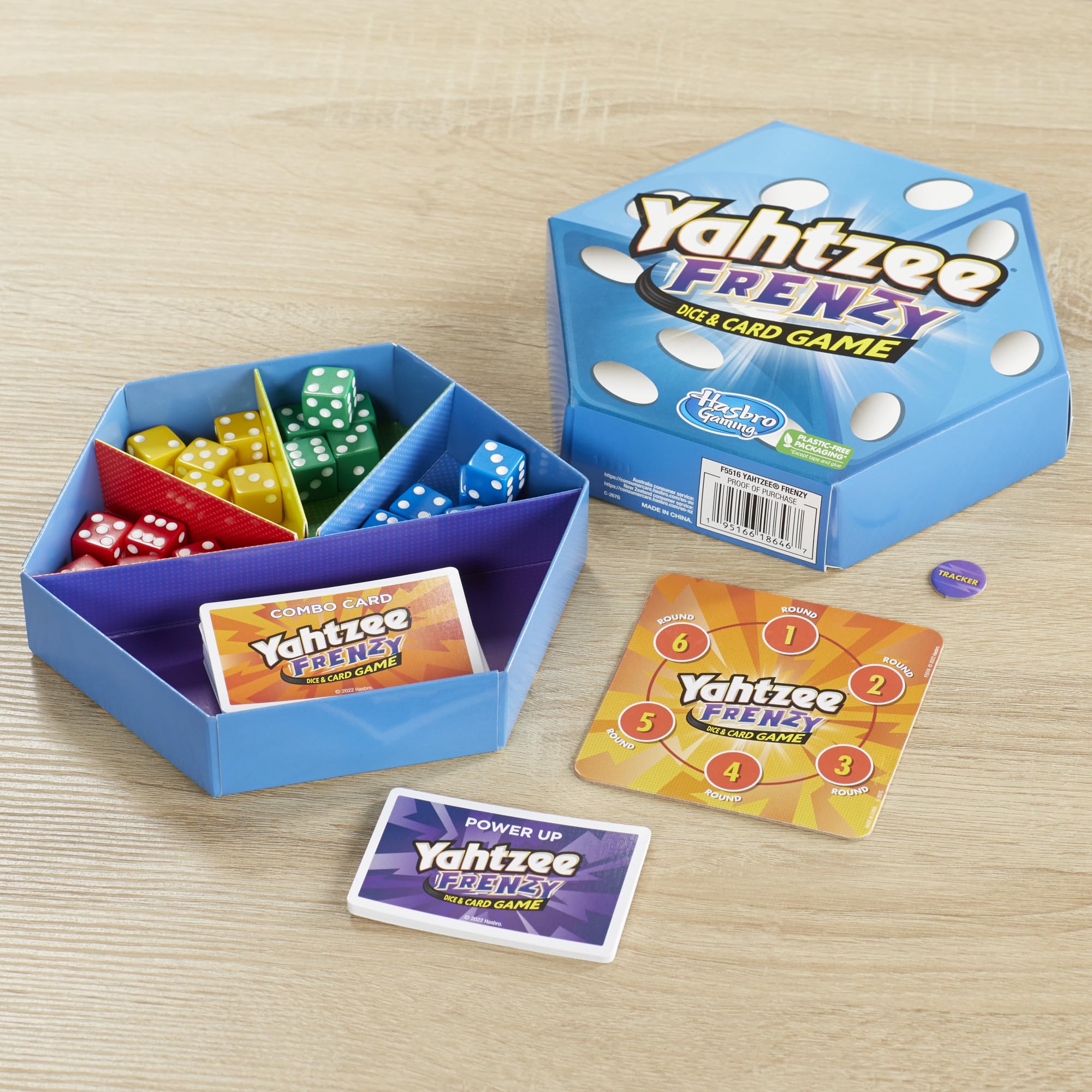 - YAHTZEE FRENZY DICE GAME & CARD GAME: At the same time, all players roll and race their dice trying to be the first one to match sets shown on the combo cards. After 6 rounds, the player with the highest score wins